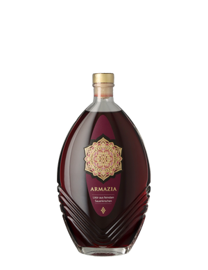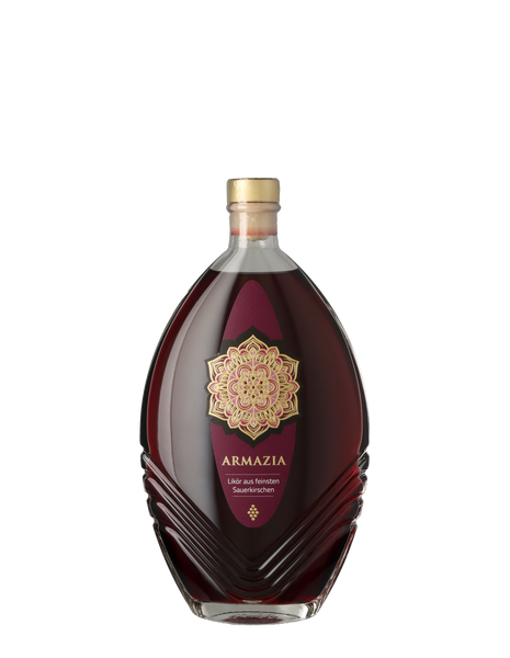The Armazia Sour Cherry Liqueur from Germany delights with its deep cherry-red color and an intense fruit aroma characterized by juicy cherries and a delicate almond note.